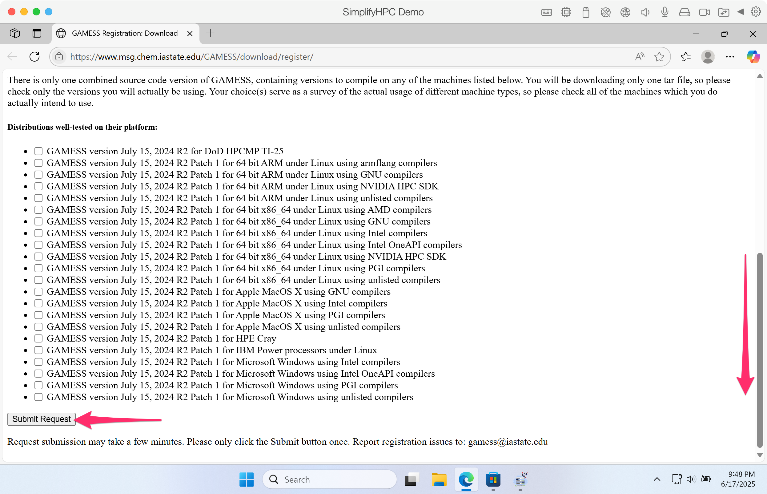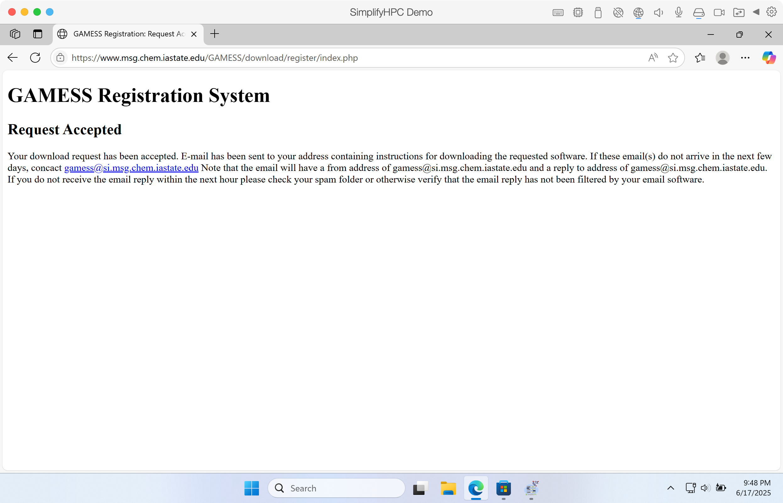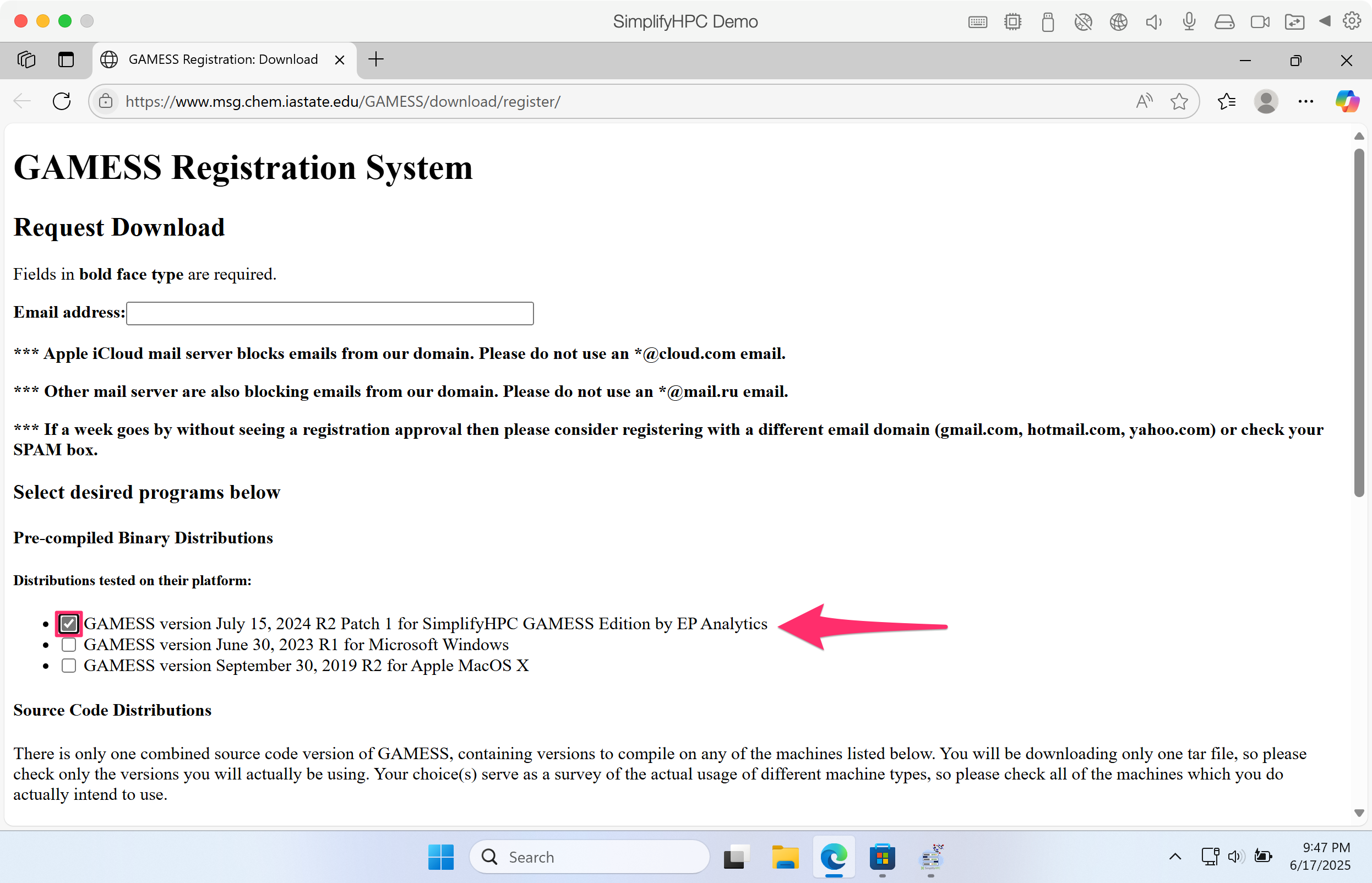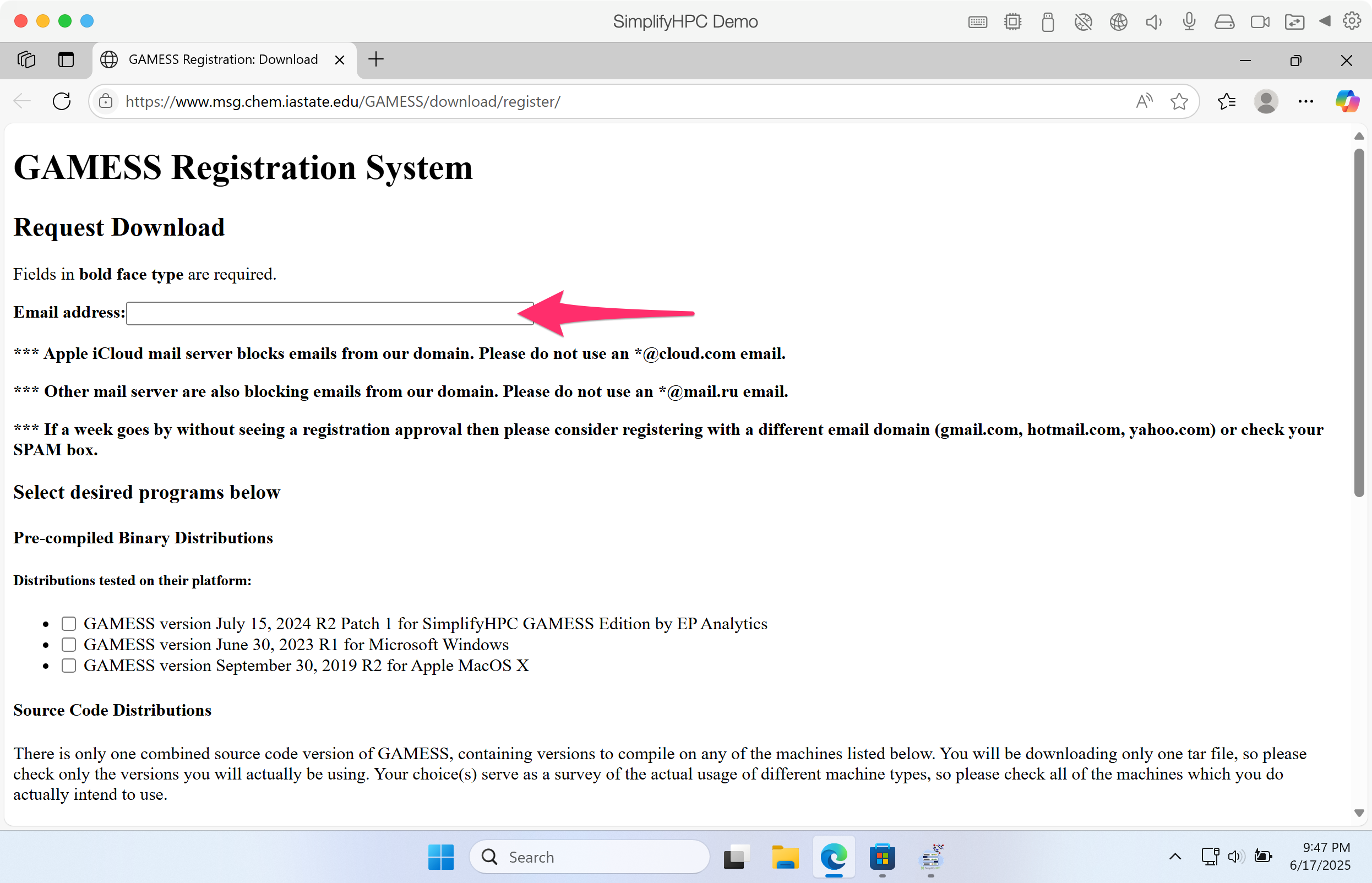 Step 6. If this is your first time using SimplifyHPC, you will need to register at the GAMESS website.